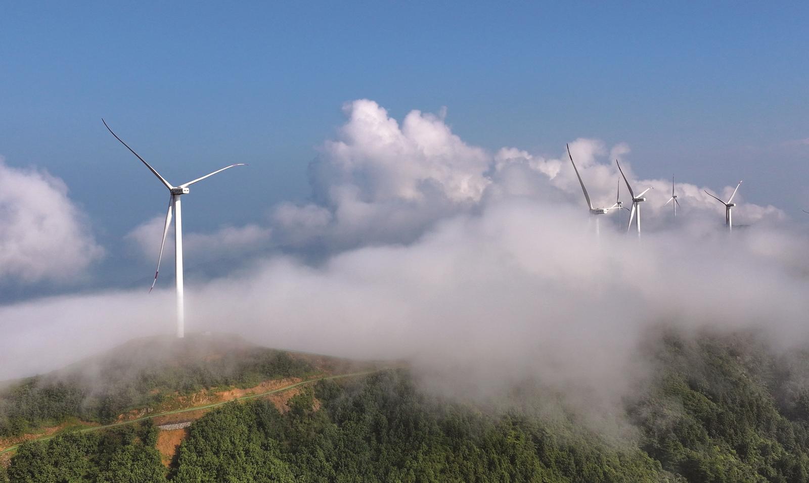 7月14日清晨,新宁县黄金瑶族乡风力发电场,青山如黛,云海缥缈,风力发电机组在云海中时隐时现,构成了一幅自然与科技相融合的美好生态画卷。