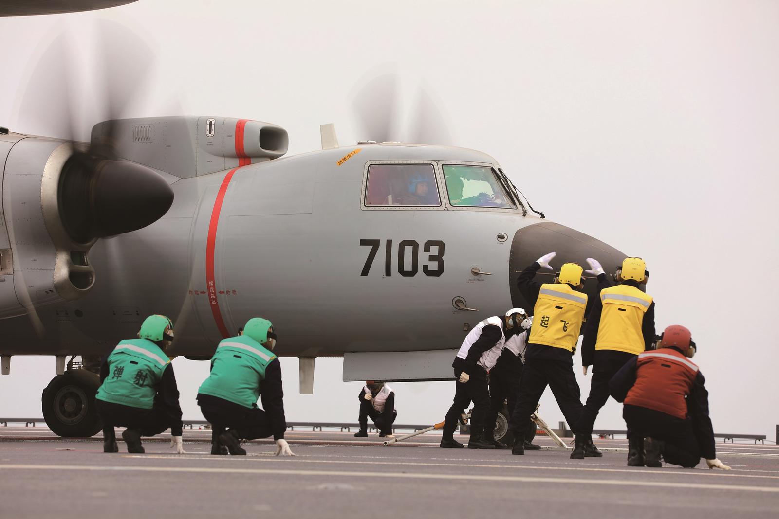 在纪念中国人民抗日战争暨世界反法西斯战争胜利80周年大会上受阅的歼-15T、歼-35和空警-600三型舰载机,已于此前成功完成在福建舰上的首次弹射起飞和着舰训练,标志着福建舰具备了电磁弹射和回收能力,对推进海军转型建设具有里程碑意义。图为空警-600舰载预警机在福建舰上电磁弹射起飞,放飞小组引导战机弹射入位。