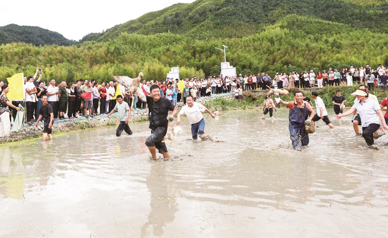 图为9月23日,在位于福建省三明市建宁县溪源乡楚尾村的丰收节活动现场,选手参加抓鸭子比赛。