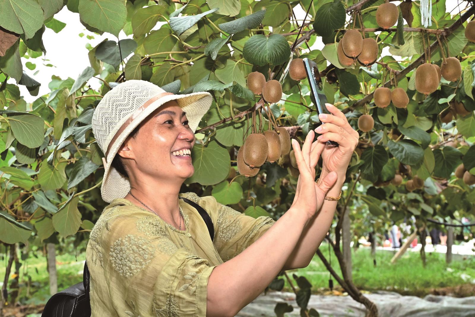 游客在隆回县金石桥镇佳瑶农业生态果园采摘“糖八子”猕猴桃