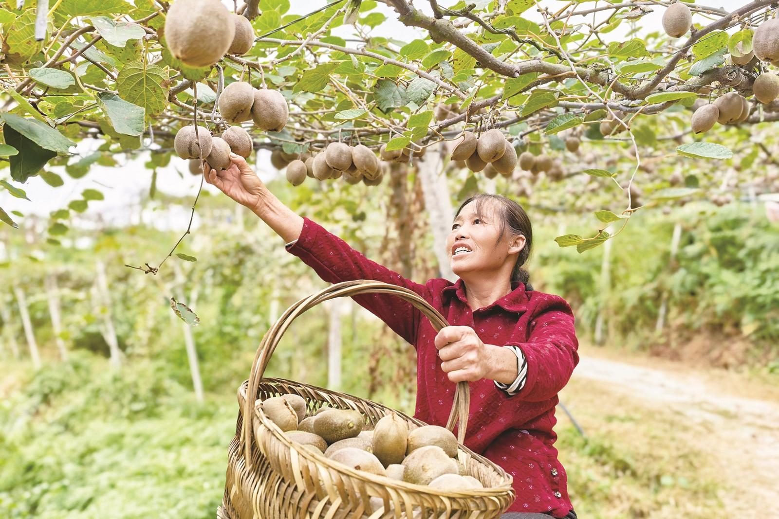 城步苗族自治县蒋坊乡竹联村延季果蔬种植专业合作社,主要种植高山猕猴桃、秋月梨、西瓜、小米椒等果蔬。该园区采用“合作社+公司+农户+基地”的模式,带动周边村民在家门口就业、创业,助力乡村振兴。图为9月25日,村民在基地采摘猕猴桃。