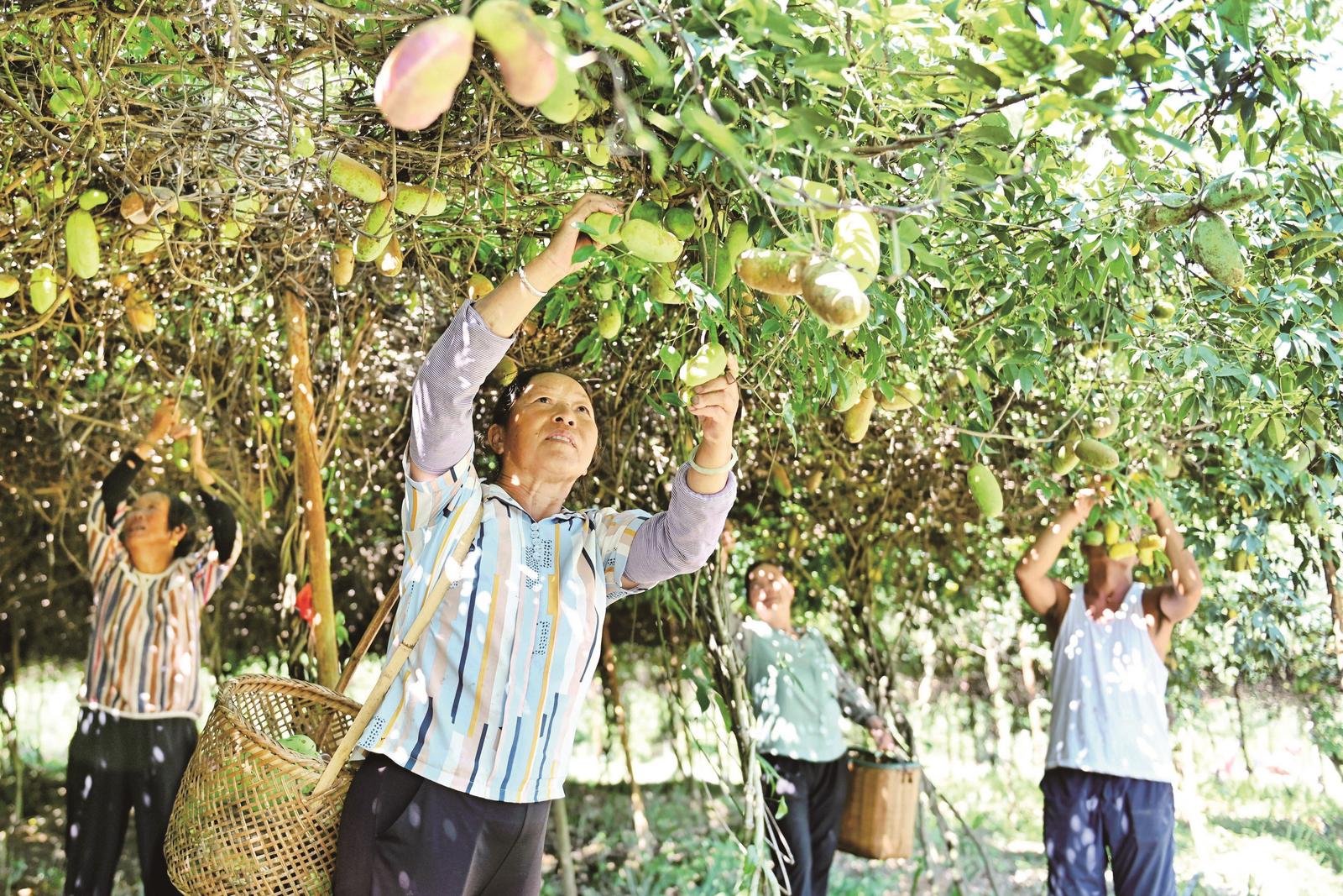 10月8日,农民在洞口县毓兰镇亿丰农林产业园采摘八月瓜。寒露时节,该县农民抢抓农时,在田间地头进行农作物秋收、秋种、秋管等农事作业。