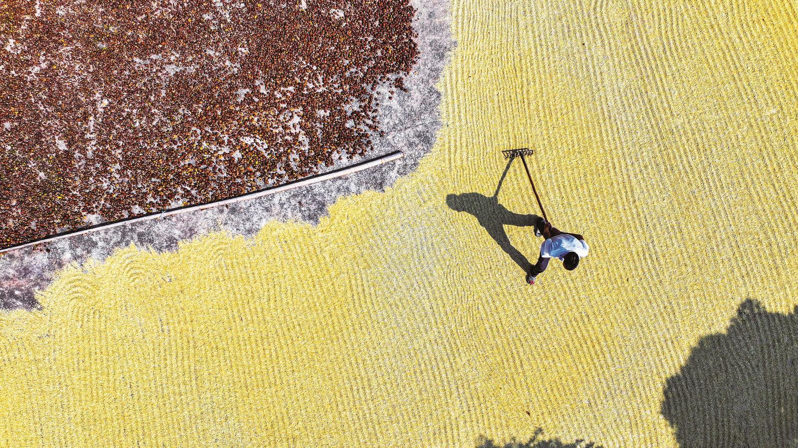 10月11日,湖南省常宁市兰江乡农民在晾晒稻谷(无人机照片)。
