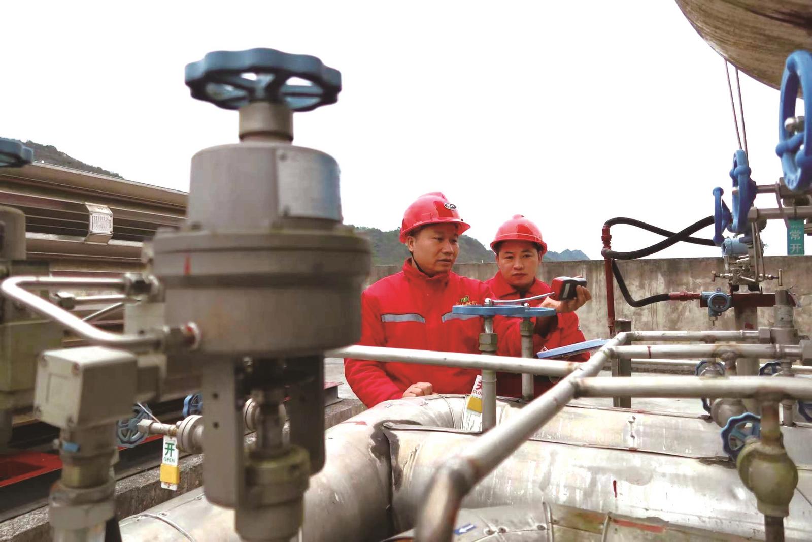 10月21日,城步新和兴天然气有限公司员工在检查燃气管道是否漏气。近期,骤然降温,城步苗族自治县强化供水、供电、供气保障力度,相关企业全力做好水、电、气的供给,加大设备检修、维护频次,确保人民群众生活不受影响。