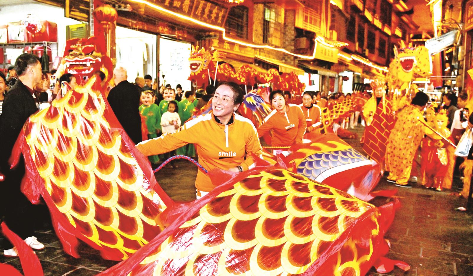 10月25日晚,民间艺人在洞口县高沙镇长裕社区展演非遗文化项目。当日,该县举行非物质文化遗产项目巡游展演活动,通过舞龙、渔鼓等非遗项目展演和互动体验,让群众深入感受非遗文化的独特魅力。