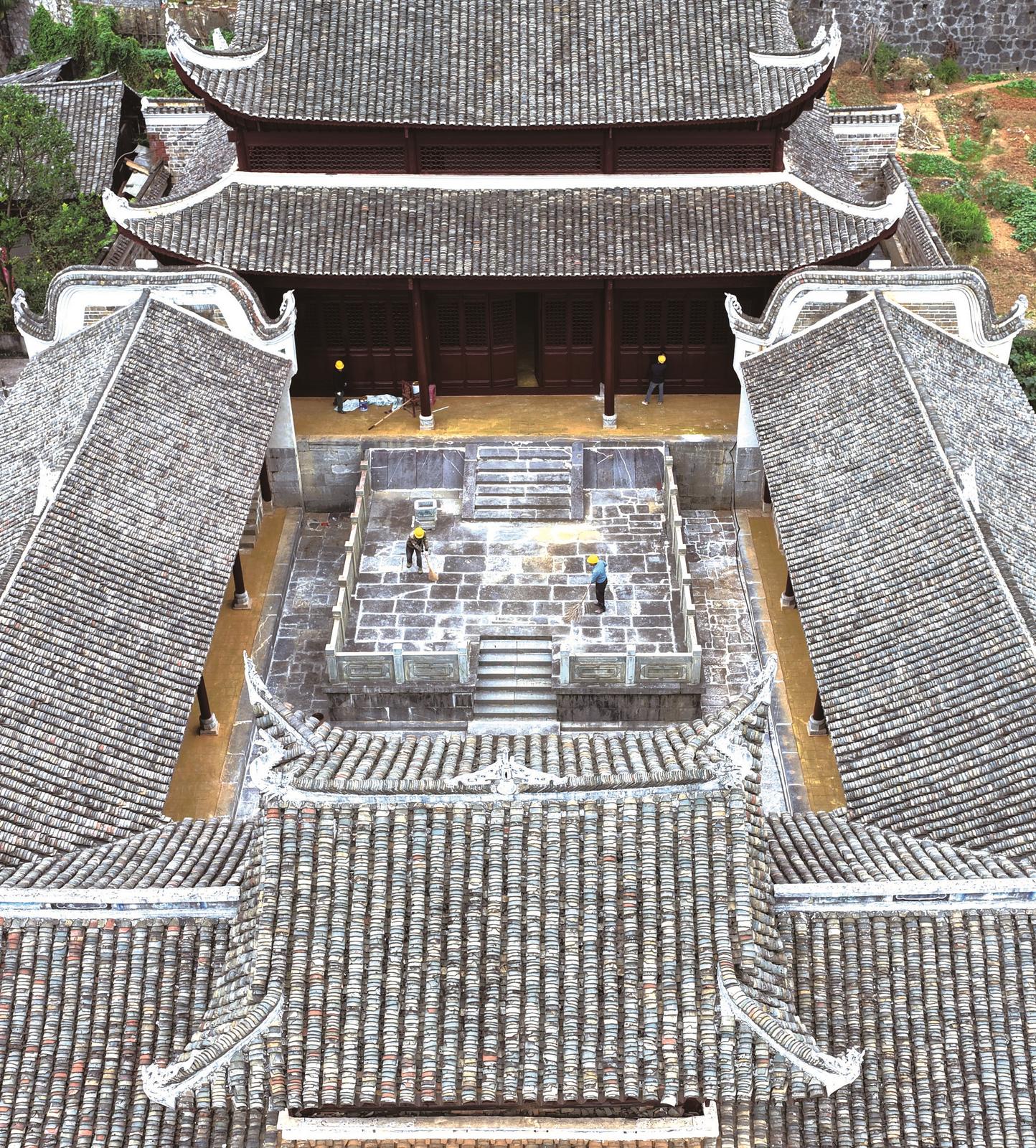 工人在进行城步孔圣庙修缮项目扫尾工作