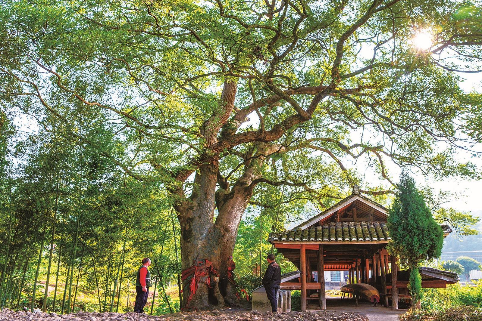 10月28日,在新宁县崀山镇六坪村小江口古桥边,游客正驻足观赏一棵500年树龄的古香樟。据统计,该县现存树龄300年至1000年以上的古树500多棵,200年以上历史的古桥40余座。近年来,这些古树、古桥吸引了不少游客前来打卡拍照。