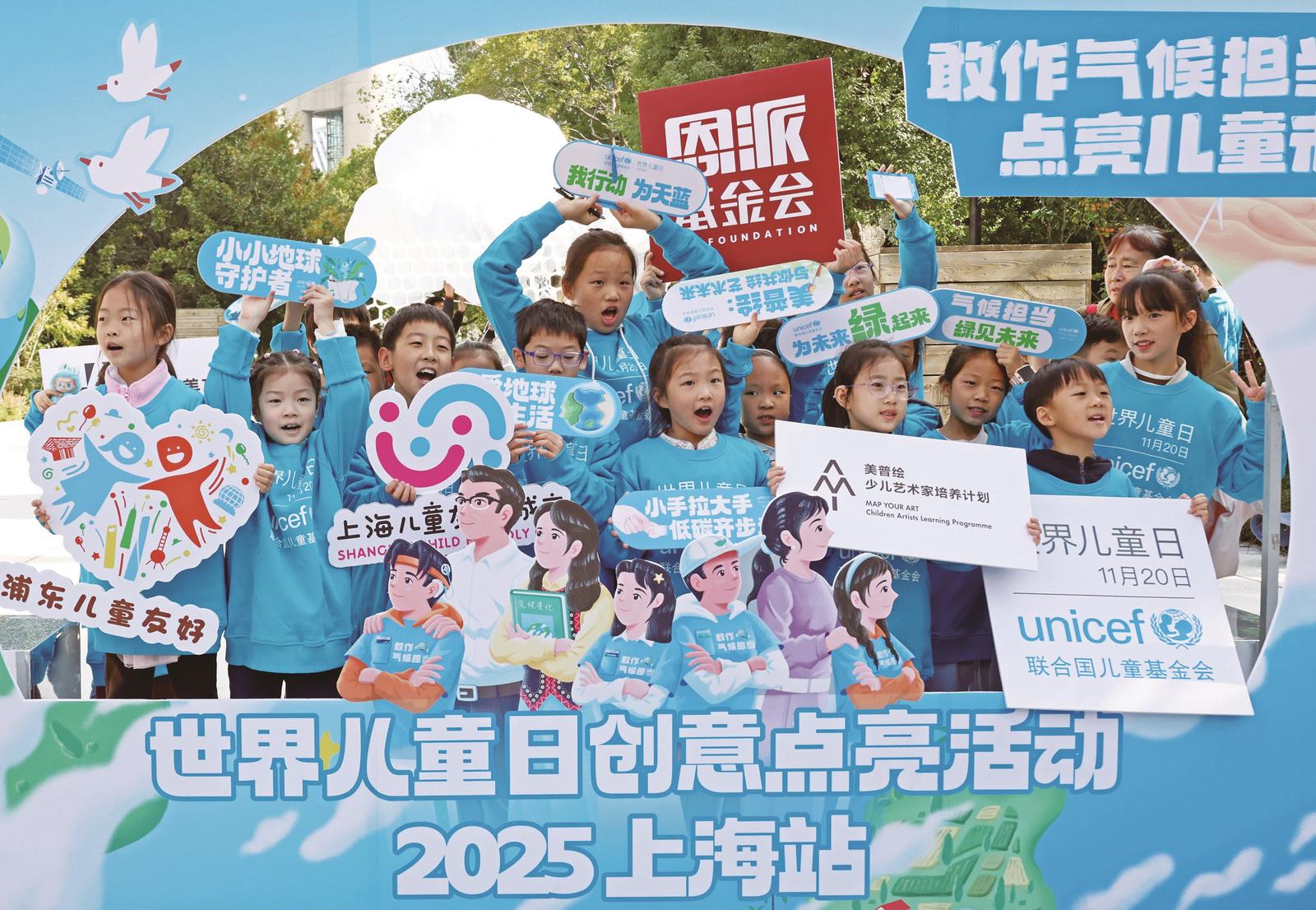 11月20日是世界儿童日。今年世界儿童日的主题是“敢作气候担当,点亮儿童未来”。各地举行多彩活动,共同迎接“世界儿童日”的到来。图为11月15日,在上海浦东美术馆领地花园举行的“敢作气候担当,点亮儿童未来”创意点亮活动中,孩子们在现场合影留念。