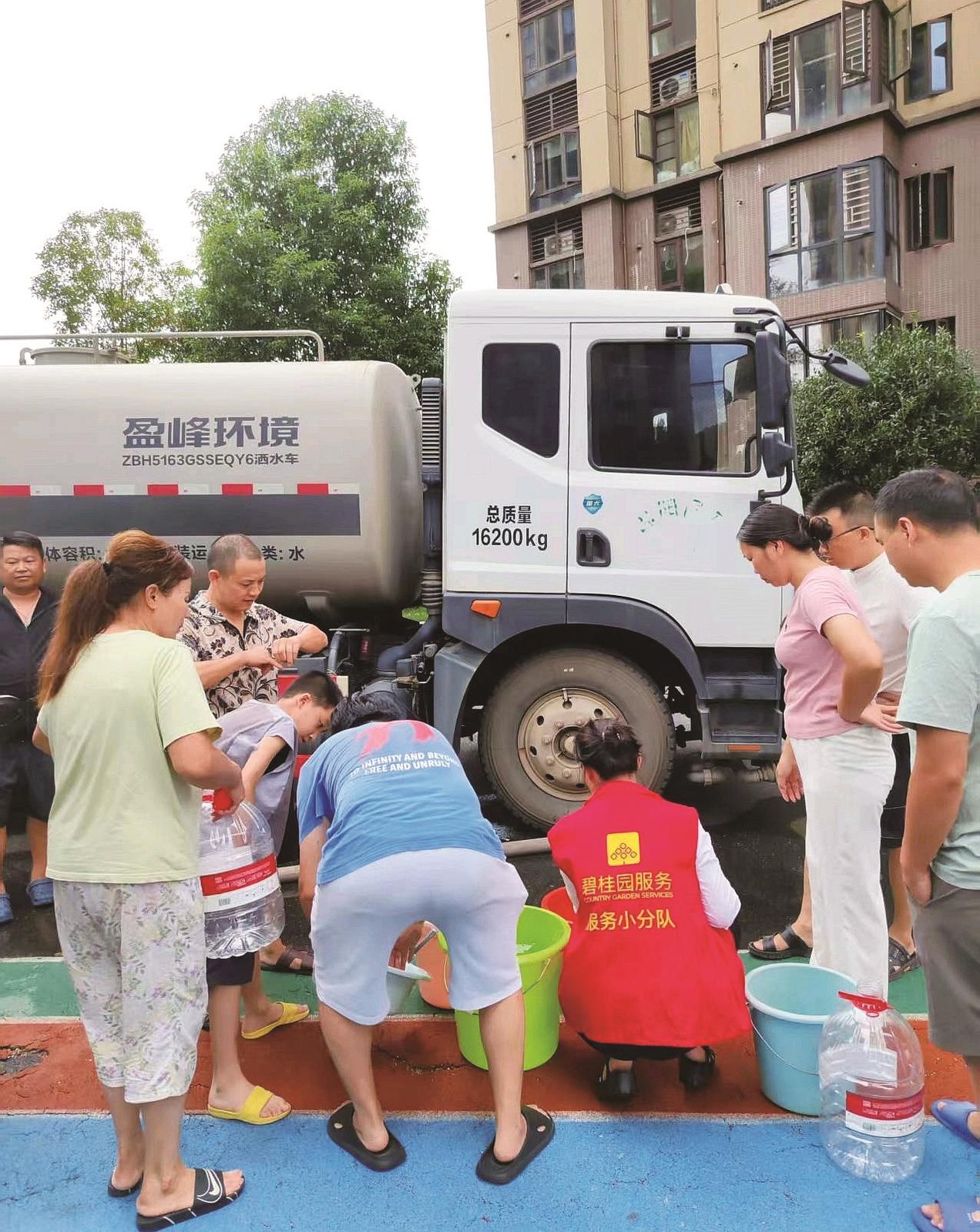 8月23日上午,因邵阳大道一自来水主管道突发爆裂,沿线大片区域紧急停水,邵阳碧桂园、碧桂园宝庆府小区等地居民陷入大热天无水可用的境地。为及时解决业主的用水难题,两个小区的物业工作人员分别联系送水车,并挑水上楼为业主送水,及时化解了一次停水危机。