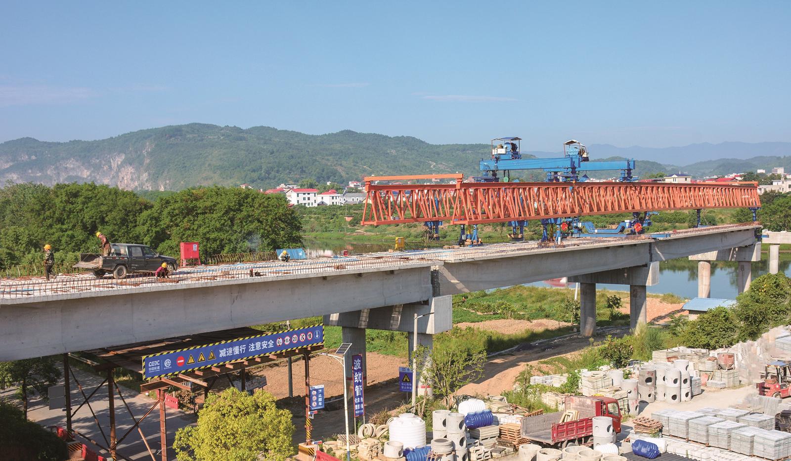 9月16日,在新宁县金石镇夫夷江上,新新高速公路二标段互通枢纽引线跨江大桥正在进行箱梁铺设。该桥长360米,桥面宽10米,预计本月底完工。目前,全线工程已进入路面摊铺阶段。