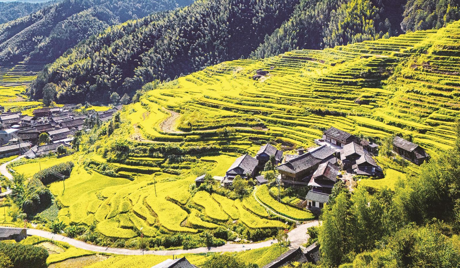 近日,城步苗族自治县长安营镇的梯田迎来丰收季,层层梯田荡起一层层金色波浪。 孙健辉 摄