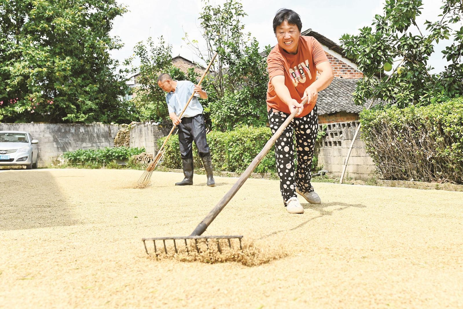 9月6日,洞口县花古街道长龙村的村民在晾晒稻谷。 滕治中 杨鹰 摄影报道