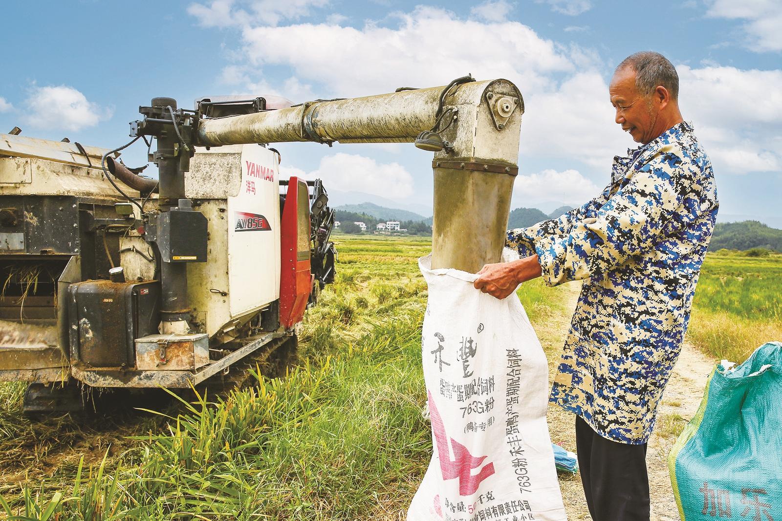 绥宁县武阳镇毛坪村喜迎水稻丰收,农户忙着将稻谷装袋入库。 张贻华 摄