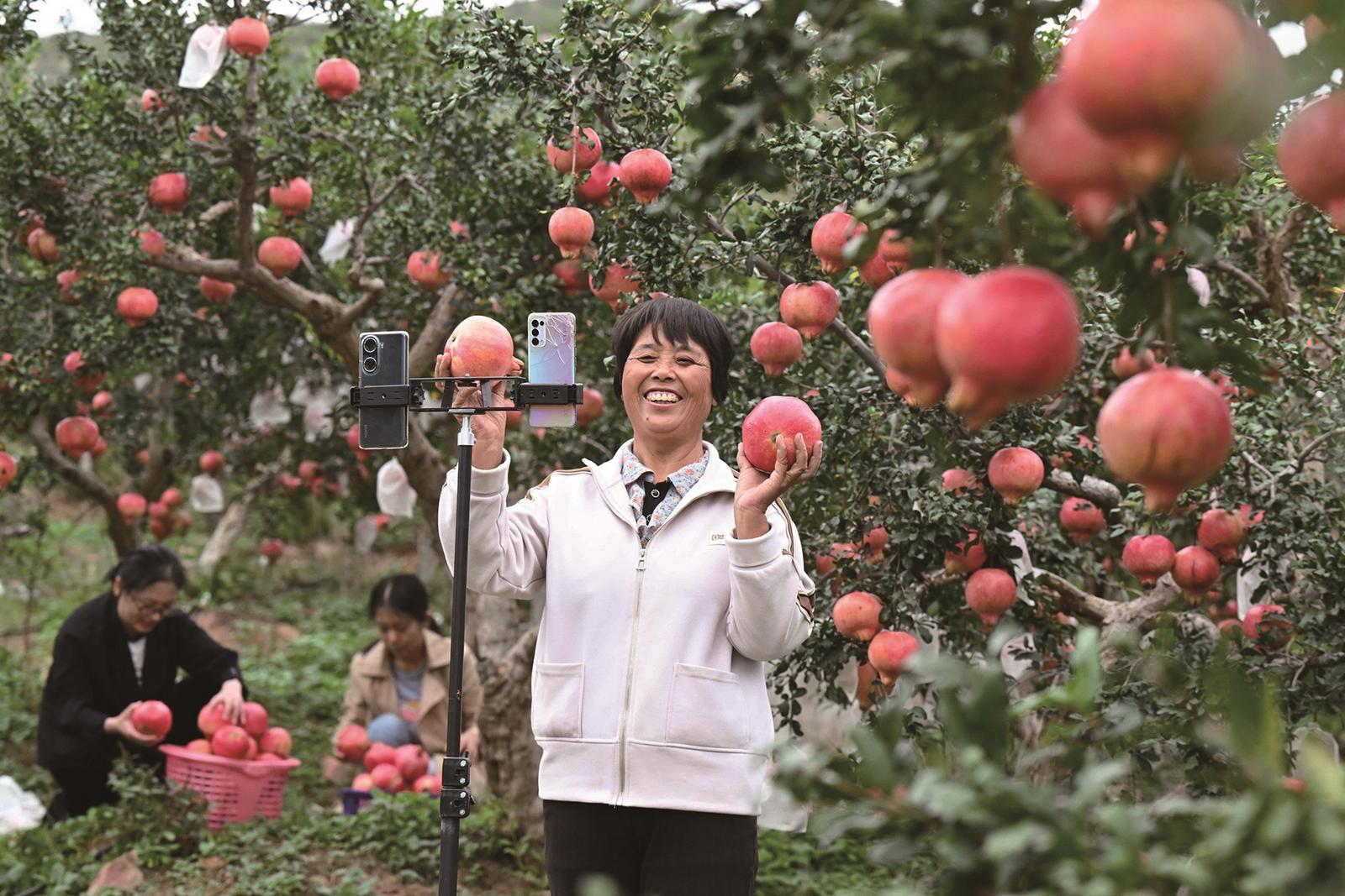 9月22日,在河北省石家庄市元氏县北正乡北正村,农民在石榴园直播带货。 新华社发(陈其保摄)