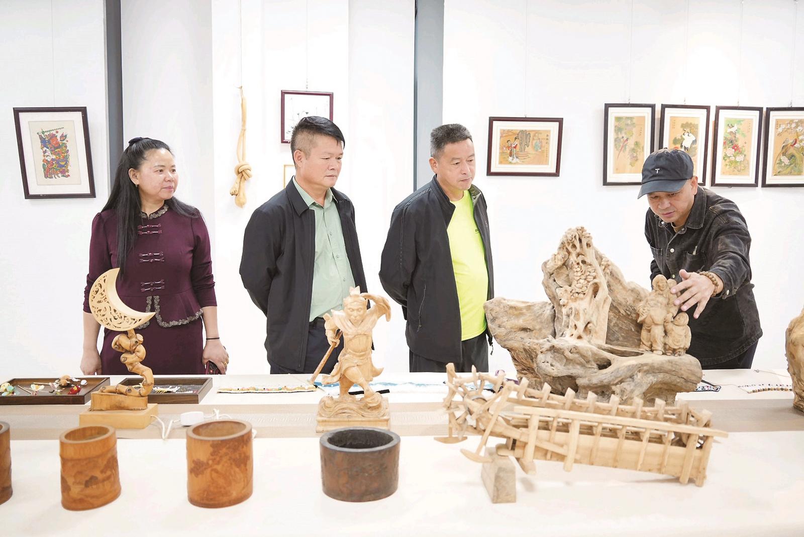 现场可见,一件苗绣披肩在传统纹样中注入现代设计语言,以细腻针脚勾勒山水意境,使古老工艺更贴近当下生活;一组根雕作品以本地枯木为材,通过匠心雕琢,将“废料”化为栩栩如生的人物与动物造型,展现“化腐朽为神奇”的技艺境界。