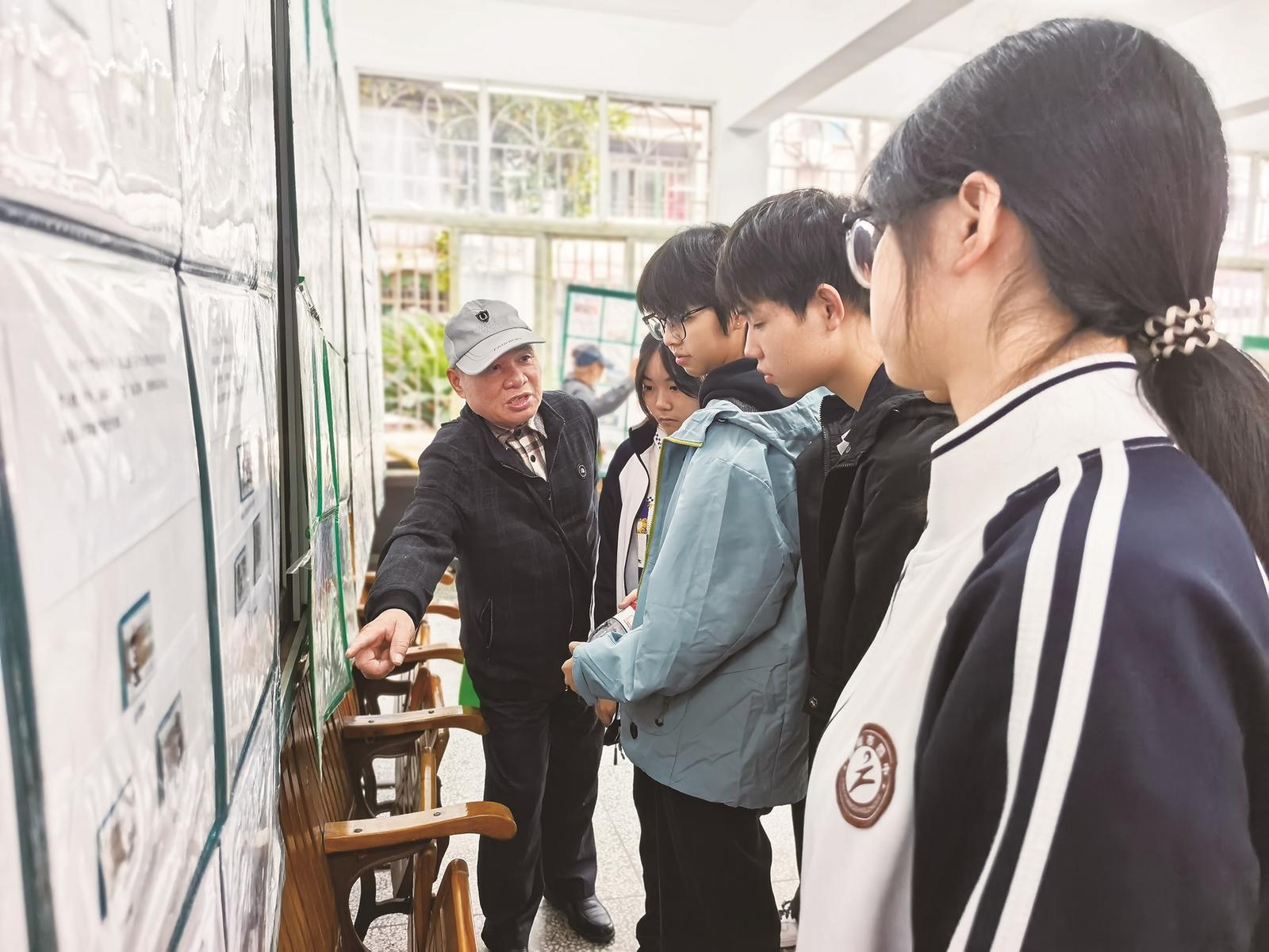 “宝庆府抗战英豪袁国平同志,在皖南事变中壮烈牺牲……希望同学们铭记英烈,以奋斗践行青春使命。”老干部化身“红色讲解员”,为学生讲述邮票背后的抗战故事。学生们或驻足聆听,或俯身细观,不时与老同志交流探讨,感悟方寸之间的精神内涵。