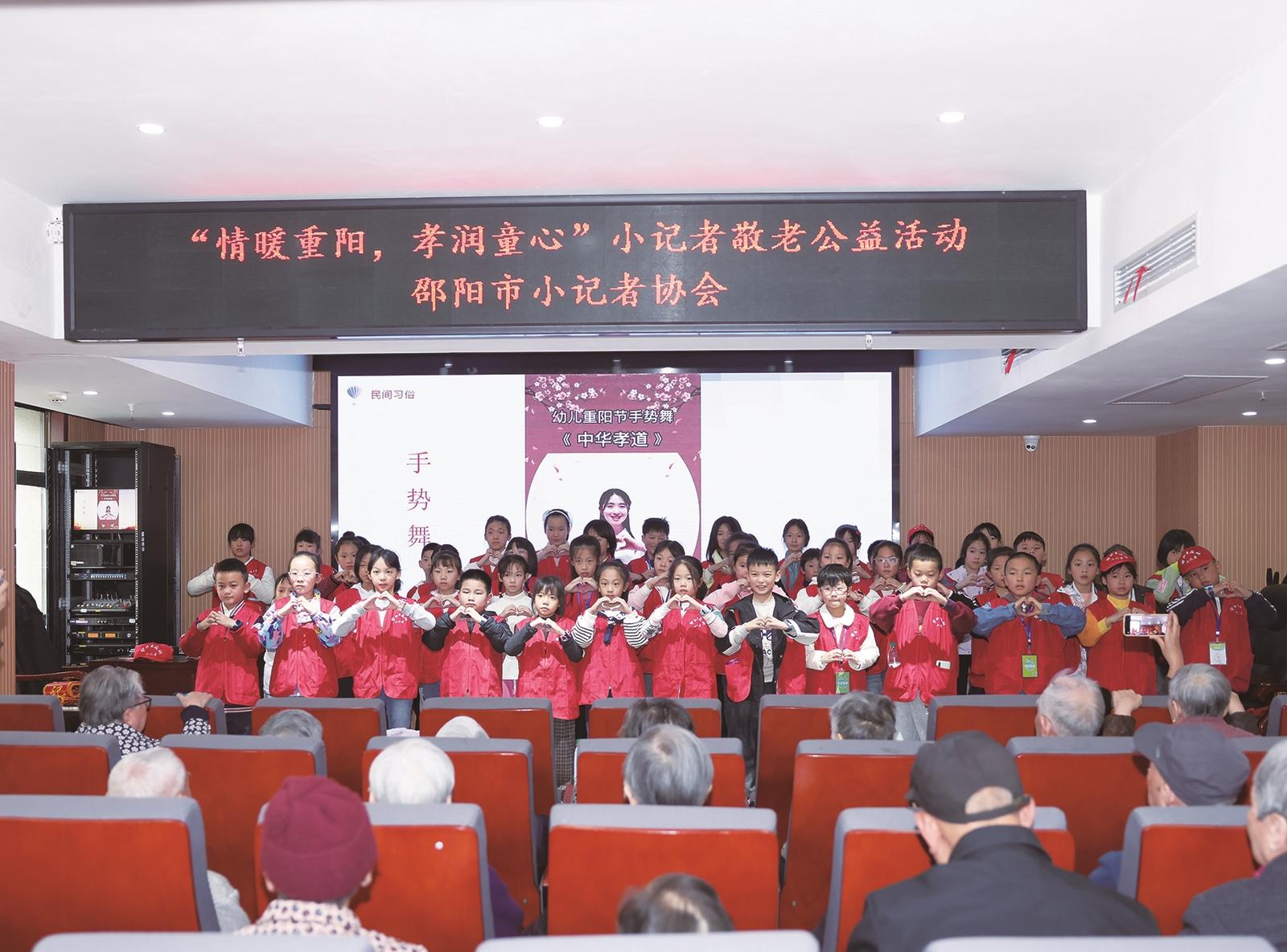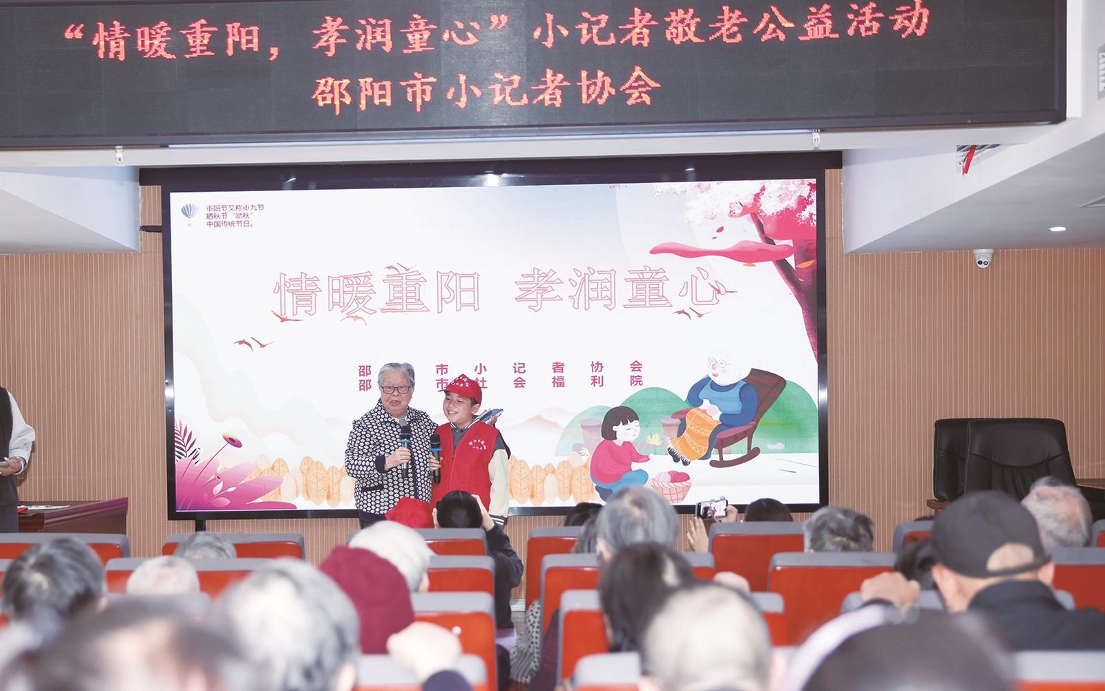 10月25日,邵阳市小记者协会到邵阳市社会福利院开展“情暖重阳,孝润童心”敬老公益活动。活动中,小记者们以稚嫩却真挚的歌声、灵动活泼的舞蹈,给老人们送上祝福。市福利院的老人们亦兴致盎然,在与小记者真情互动的同时,登台演唱经典老歌。一时间,掌声与笑声此起彼伏,汇成了一曲温暖动人的乐章。