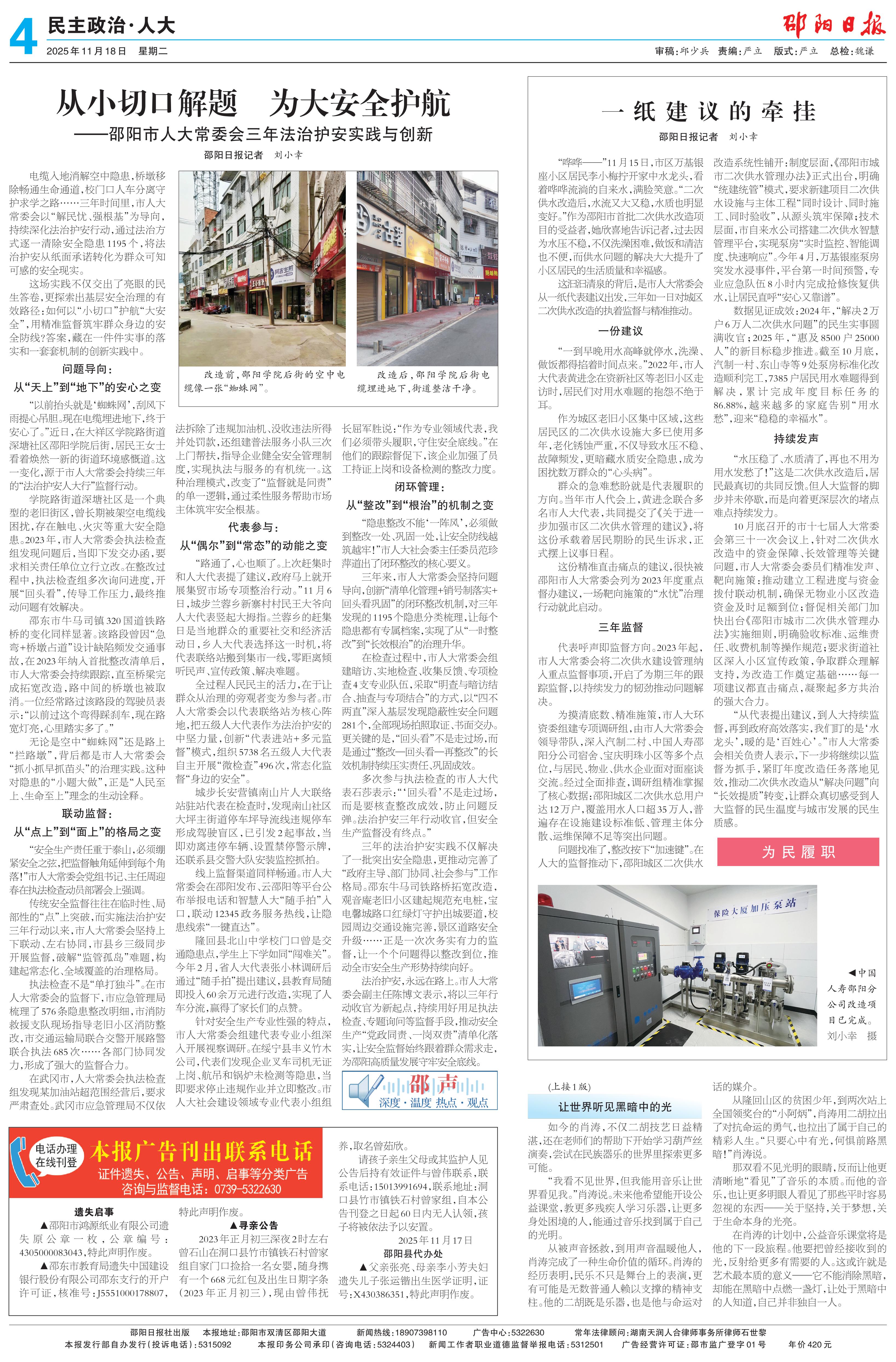 电缆入地消解空中隐患,桥墩移除畅通生命通道,校门口人车分离守护求学之路……三年时间里,市人大常委会以“解民忧、强根基”为导向,持续深化法治护安行动,通过法治方式逐一清除安全隐患1195个,将法治护安从纸面承诺转化为群众可知可感的安全现实。
