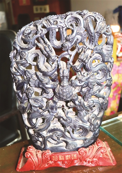 收集之路有苦有甜,更多的还是收获心爱之物的喜悦。说着,朱安清从一个包裹多层的盒子里取出他收藏多年的洞口墨晶石雕作品《九龙戏珠》。这件藏品是他于2003年从隆回一个收藏爱好者手中,花了6万元购得的。“这是洞口墨晶石雕刻老艺人雷桂云的作品,曾于1957年在湖南省工艺美术展览会上首次展出,并入展同年举行的首届广州中国出口商品交易会,获得高度赞誉。它采用三层镂空精雕,雕刻的九条龙神态各异,栩栩如生,是一件不可多得的珍品。”朱安清得意地说。