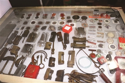 朱安清说,收藏是一门学问,越学越深奥,越钻越有意思。朱安清收藏室的玻璃展柜里,摆满了各种铜锁、勋章、胸章、像章等,橱柜里和桌上陈列着瓷器、钱币、窗花板、洞口墨晶石雕等各类古玩和老物件,给人一种浓厚的历史沧桑感。“这些大都是从古玩市场收来的,只要是看上眼的,我就买回来。”为此,朱安清常年辗转于北京、广州、长沙、上海等地,用“以藏养藏”的方式,寻找流落在民间的“宝贝”。