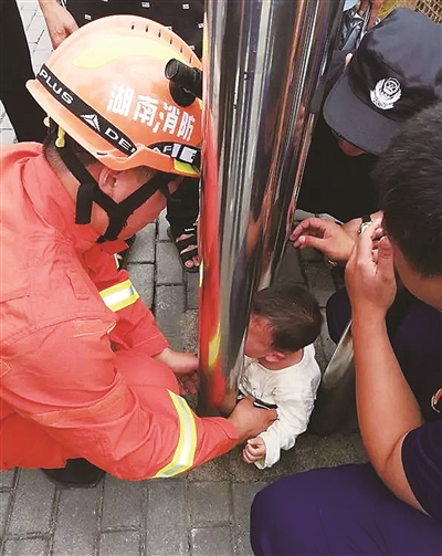 本报讯 6月24日上午,在北塔区魏源西路,一名2岁左右的小男孩因好奇将下半身蹲进闲置广告牌灯箱孔里,出来时却被卡住。所幸北塔消防大队队员及时赶到现场救助,让其成功脱困。