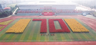 活动当天,5000多名大学生奔跑着在田径场集结,方阵所组成的“70”字样喻示中华人民共和国成立70周年。从高空俯瞰,格外壮观。
