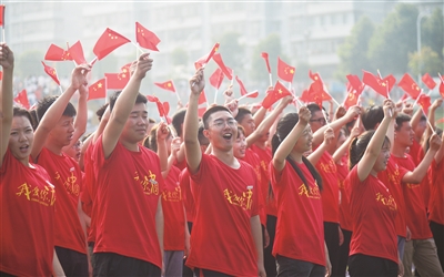 9月10日上午,邵阳学院在七里坪校区田径运动场举办师生向祖国深情告白活动,师生们挥舞国旗,同声表达对祖国的热爱。