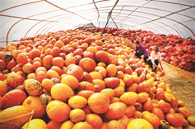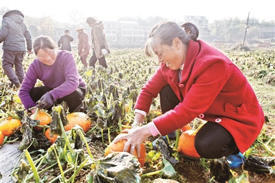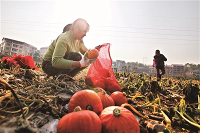 12月6日,大祥区城南街道台上村务工群众,正忙着收获满地的“金瓜”板栗南瓜,将采摘的南瓜分拣、装袋,大家脸上洋溢着丰收的喜悦。