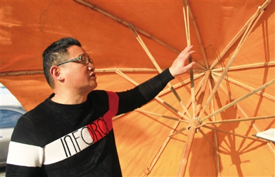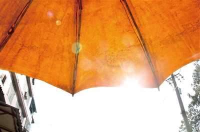 “宝庆油布伞自清代传承至今,我的祖辈几代人付出了艰辛的努力,我不能让这么好的技艺失传。”12月9日上午,在双清区五一南路延伸段铁砂岭小学入口处一民房前,宝庆油布伞市级非遗传承人龙智群撑开一把硕大、金黄的油布伞,向笔者介绍完其主要构造、制作工艺和发展方向后,信心满怀地说。冬日暖阳的照射下,伞下弥漫着桐油的清香,让人心旷神怡。他将存放在仓库里的油布伞全部搬出来,放在太阳下晾晒,其父亲龙目生用毛巾轻轻擦拭伞架上的灰尘。