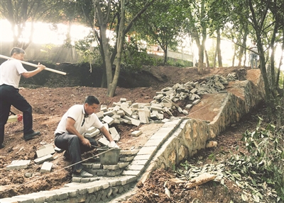 7月11日,新邵县赛双清公园提质改造项目施工现场,施工人员正在铺设游道。该项目总投资近800万元,工程内容包括景观工程和园林绿化工程建设、灯化亮化、山体滑坡治理以及建筑物立面改造等。工程于今年4月动工,预计今年底竣工。