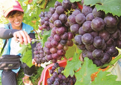7月9日,新宁县清江桥乡赤木村10组农民左中云,正在葡萄园里高兴地为上园游客采摘新鲜葡萄。近年,该乡党委政府引领扶持农民发展果园种植脫贫致富。今年,赤朩村种植优质葡萄170多亩,当前正值葡萄成熟上市,平均亩产达1500公斤,每亩可创收1.8万元。