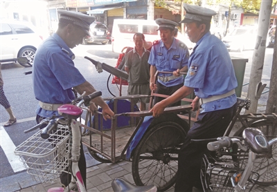 8月2日,在北塔区江北大市场,市交警支队民警将市民乱停乱摆的三轮车抬到停车泊位上。据介绍,市交警支队在市区部分市场专门施划了非机动车泊位,以维护市场秩序。