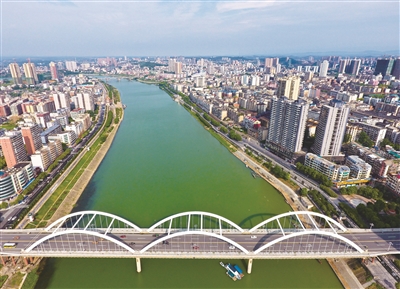入秋后的邵阳天高云淡,资水碧绿如黛。图为俯瞰下的市区西湖桥段资江两岸。