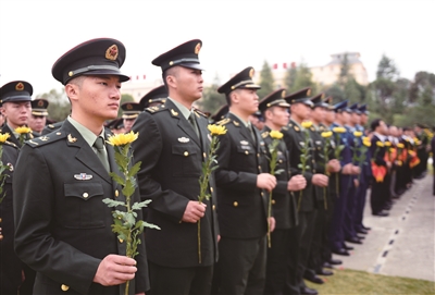 10月18日,解放军战士在凭吊仪式上。 当日,广西桂林市各界代表1200余人在桂林市兴安县湘江战役纪念公园举行凭吊仪式,缅怀在湘江战役中牺牲的先烈,纪念红军长征胜利80周年。 新华社发