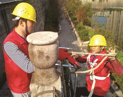 邵水河沿岸亮化工程起于市区沿江桥止于佘湖桥,全长3.9公里。目前,市区邵水两岸景观照明工程正加紧施工,预计春节前完工。图为12月4日,施工人员正在邵水河步月桥附近安装线管。
