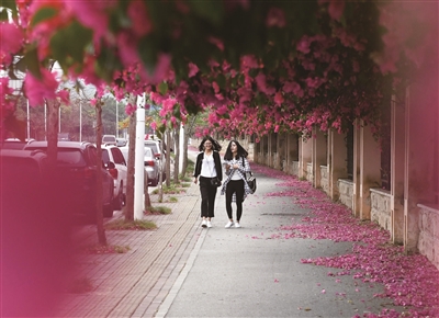 4月11日,市民在广西南宁市青环路漫步。 时下正是三角梅怒放的时节,绵延数公里的三角梅让广西南宁青环路成了艳丽的鲜花大道,吸引众多市民前来观赏。新华社发