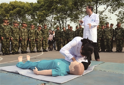 “下面,有没有谁愿意来试一试?”急救演示完毕后,护士长蒋佳喜向现场的官兵们发出邀请。