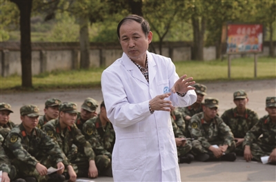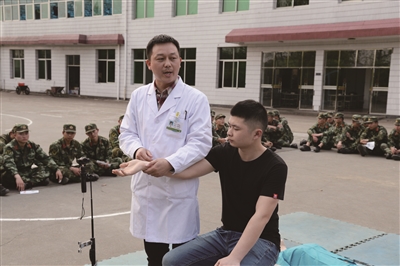 “手掌要靠前一点,手臂不能弯,每次间隔只吹气两次……”一旁的唐会林主任,认真地讲解着,不时上前手把手纠正小战士的一些不规范动作。