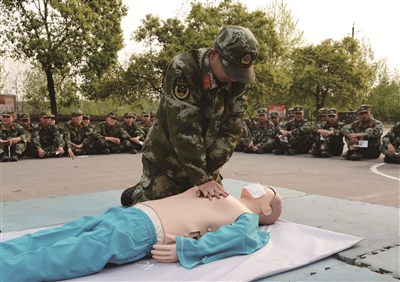 紧接着,两位曾多次参加国家、省、市各类护理竞赛并获奖的急诊科护士长蒋佳喜和科研培训办副主任张凯来到模拟道具前,进行了一番操作——“首先轻拍病患双肩并呼叫病患,仔细观察他是否有反应,然后要清除病患口腔中异物,接着解开病患的外衣,在保证他呼吸道畅通的情况下,左手在上,与右手手指轻轻交叉,放在病患的胸部中间,腕肘关节要伸直,利用身体重力,垂直向下用力按压,一下、两下、三下……”武警官兵们认真地看着模拟操作,坚毅的脸上时不时露出会心的笑容。