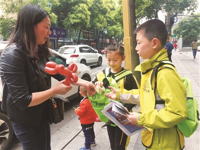 在邵阳火车站附近,红队的小朋友看到有很多的家长带着孩子在散步,便蜂拥而去。红队的王同学走到一名2岁多的小朋友面前,逗孩子玩了起来。“小弟弟,想不想要玩气球啊,这个气球可好玩了。”王同学看着小弟弟对气球特别地感兴趣,便开始向孩子的妈妈推销起气球来。小孩妈妈