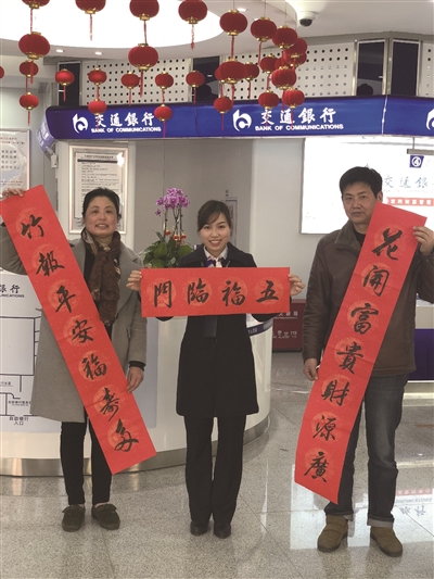 本报讯 为弘扬传统文化魅力,营造欢乐喜庆的春节氛围,2月2日至9日,交通银行邵阳分行特邀市书法家协会在4个网点分别开展“喜迎新春,狗年送祝福”写春联活动,并现场免费赠送春联,将新年祝福送到每位客户手中。