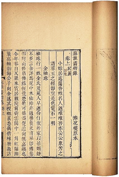 车持谦(1778-1842),又名守谦、子尊,字秋舲,号捧花生,是大任兄弟大敬的第七代孙,其代表作是与《扬州画舫录》齐名的《秦淮画舫录》。该书成书于嘉庆二十二年(1817),写的是南京秦淮河一带的风月佳话。书前有杨文荪、汪度、陈云楷及作者本人的四篇序言,书后有马功仪、长海两跋。书分上下两卷,上卷为“记丽”,即为130余位秦淮名伎作传。下卷为“征题”,收集了江南文人酬唱的作品。书中所描绘的尽管是出身青楼而非深闺的女子,但都才艺超绝、敢爱敢恨、个性鲜明活泼,远非俗不可耐的陪酒卖笑之辈。比如,写到一位叫金袖珠的美女,“嗜读《红楼梦》,至废寝食,《海棠》《柳絮》诸诗,皆一一背诵如流”。书中还记载了一些善于唱昆曲的丽人,如纪招龄“心绝慧悟,无论新声旧谱,才一按拍,如银瓶泻水,使人听之忘倦”;陆绮琴“其父本梨园老教习,探亲过白门,遂家焉,绮琴早按宫商,妙娴丝竹”。