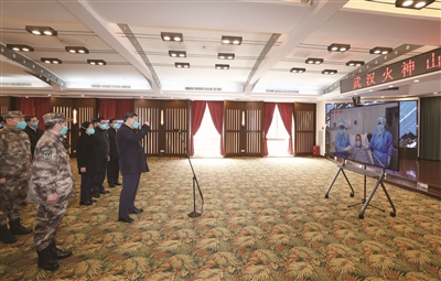 在火神山医院指挥中心,习近平听取医院建设运行、患者收治、医务人员防护保障、科研攻关等情况介绍。习近平指出,疫情发生以来,包括军队在内的广大医务工作者发扬特别能吃苦、特别能战斗的精神,义无反顾奔赴湖北和武汉,毫无畏惧投入防控救治工作,日夜奋战,舍生忘死,不负重托,不辱使命,同时间赛跑,与病魔较量,为武汉疫情防控工作作出了重要贡献。军队医务人员牢记我军宗旨,召之即来,来之能战,战之能胜,为党旗、军旗增添了光彩。沧海横流,方显英雄本色。你们真正做到了救死扶伤、大爱无疆。你们是光明的使者、希望的使者,是最美的天使,是真正的英雄!党和人民感谢你们!