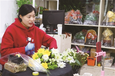 4月1日,记者走访市区部分花店发现,鲜花销售升温,菊花成为当前的热销产品。图为邵水东路一花店内,店主唐女士一边包扎花束,一边通过网络直播平台推销祭祀鲜花。