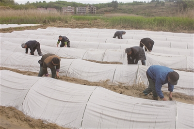 为抓好早稻集中育秧工作,大祥区蔡锷乡组织9个村的专业合作社集中为农户购买种子和育秧,目前育秧工作已完成80%。图为3月31日,蔡锷乡新林村专业合作社组织劳动力正在农田育秧盖膜。