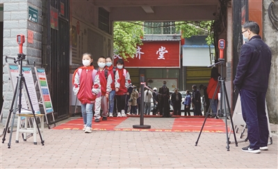 当天上午,在大祥区西直街小学临津门校区大门口,广播里正一遍遍地播放着“入校温馨提醒”,校门口已设置了两条入校通道,通道上每隔一米都张贴了“间隔标识”,各年级学生分批错时赶到学校,经入校通道进入校门,并经过红外线体温检测正常后方可进入教室。