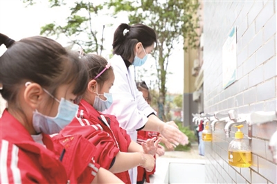 4月20日,双清区34所小学有序开学,在经过体温测量、校园消杀等多项防疫措施后,22232名学生陆续返校复课。图为开学首日,爱莲街道医护人员给博文小学的孩子们讲解“七步洗手法”。